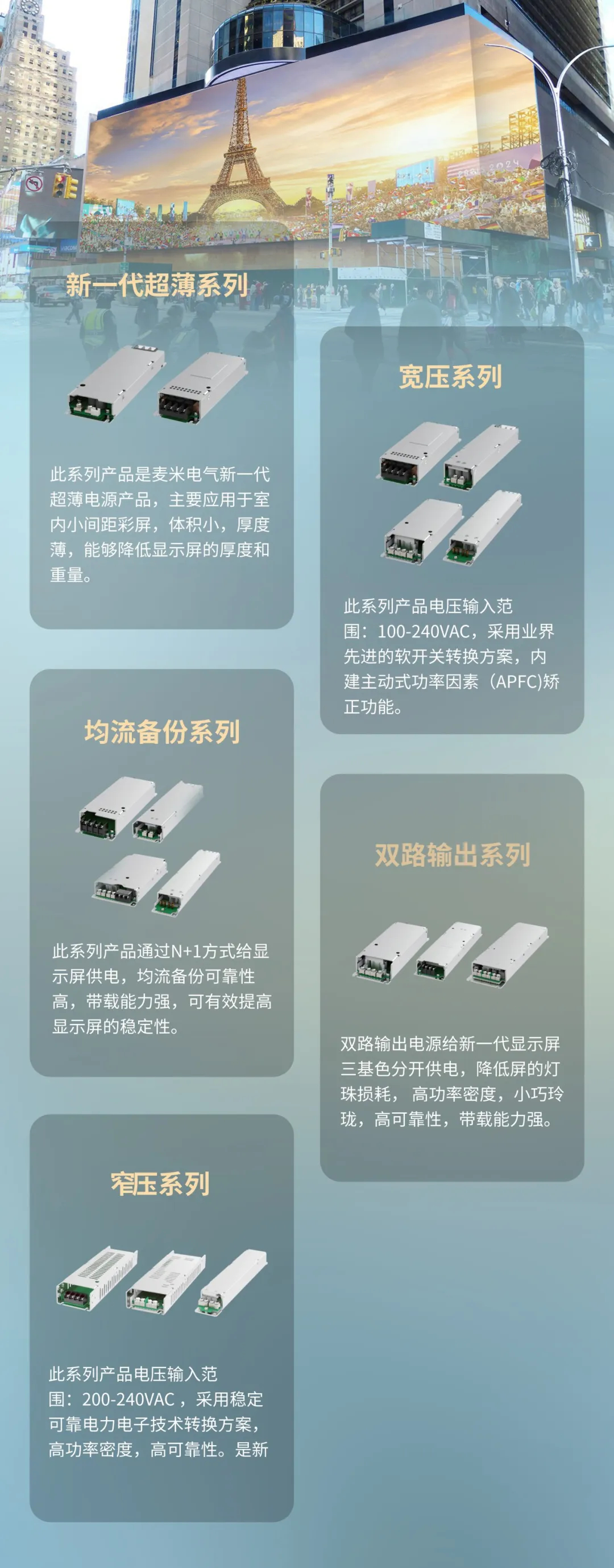 ´ÓչʾÆÁµ½¼Ç·ÖÆÁµ½¿´Ì¨ÆÁÔÙµ½×ª²¥ÊÒµÄÅä¾°ÆÁ£¬°¬¸¥É­±´²©ballbet¹ÙÍøµçÆøÎªLEDÏÔʾÐÐÒµÌṩµÄµçÔ´½ÓÄÉÒµ½çÏȽøµÄÈí¿ª¹Ø×ª»»¼Æ»®£º¾ß±¸×Ô¶¯Ê½¹¦ÂÊÒòÊý£¨APFC£©½ÃÕý¹¦Ð§£¬¸ß¹¦ÂÊÃܶÈ£¬´øÔØÄÜÁ¦Ç¿£¬Ð¡ÇÉÁáçç¡¢¼õСÁËLEDÏÔʾÆÁµÄºñ¶È ¡£