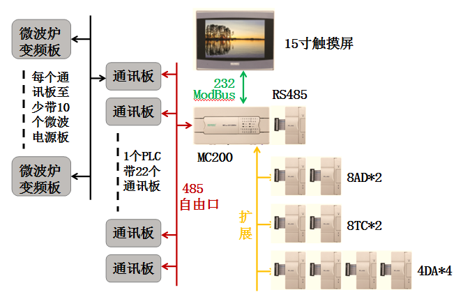 ¸Ã×°±¸ÖУ¬PLCͨ¹ýRS485ͨѶ£¨×ÔÓÉ¿ÚÐÒ飩Óë22¿éͨѶ°å¾ÙÐÐͨѶÅþÁ¬¡£Ã¿¿éͨѶ°å¿ØÖÆÈô¸É¸ö¹¤ÒµÎ¢²¨µçÔ´£¬¶Ô΢²¨µÄÆôÍ£ºÍ¼ÓÈȹ¦ÂʾÙÐпØÖÆ¡£